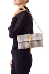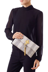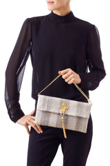 Understated in style and embellished with a delicate, finely worked filigree disc and a pretty metal pompom, this clutch is distinctively simple and chic, making it ideal for every sort of function, or more simply for dining out.